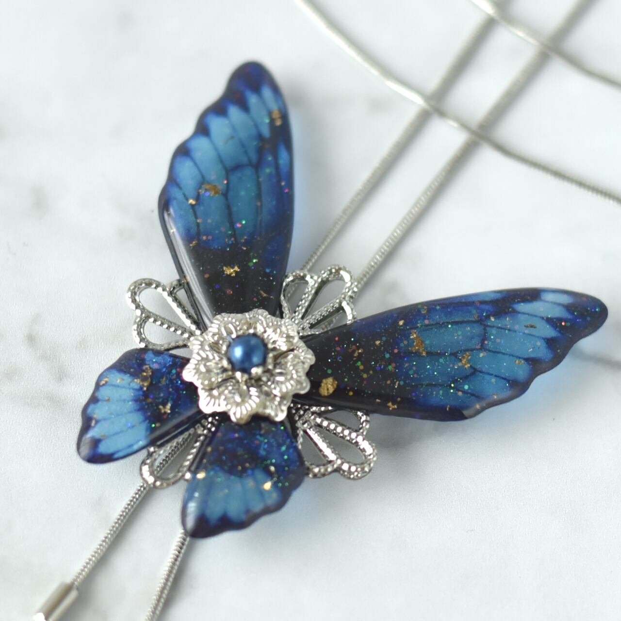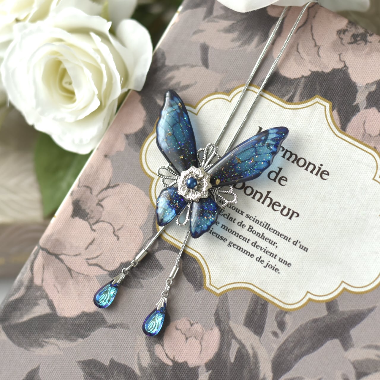 幸せの青い蝶|ガラスが煌めくネイビーグラデーションのループタイネックレス/幻想 蝶 ファンタジー ラリエット