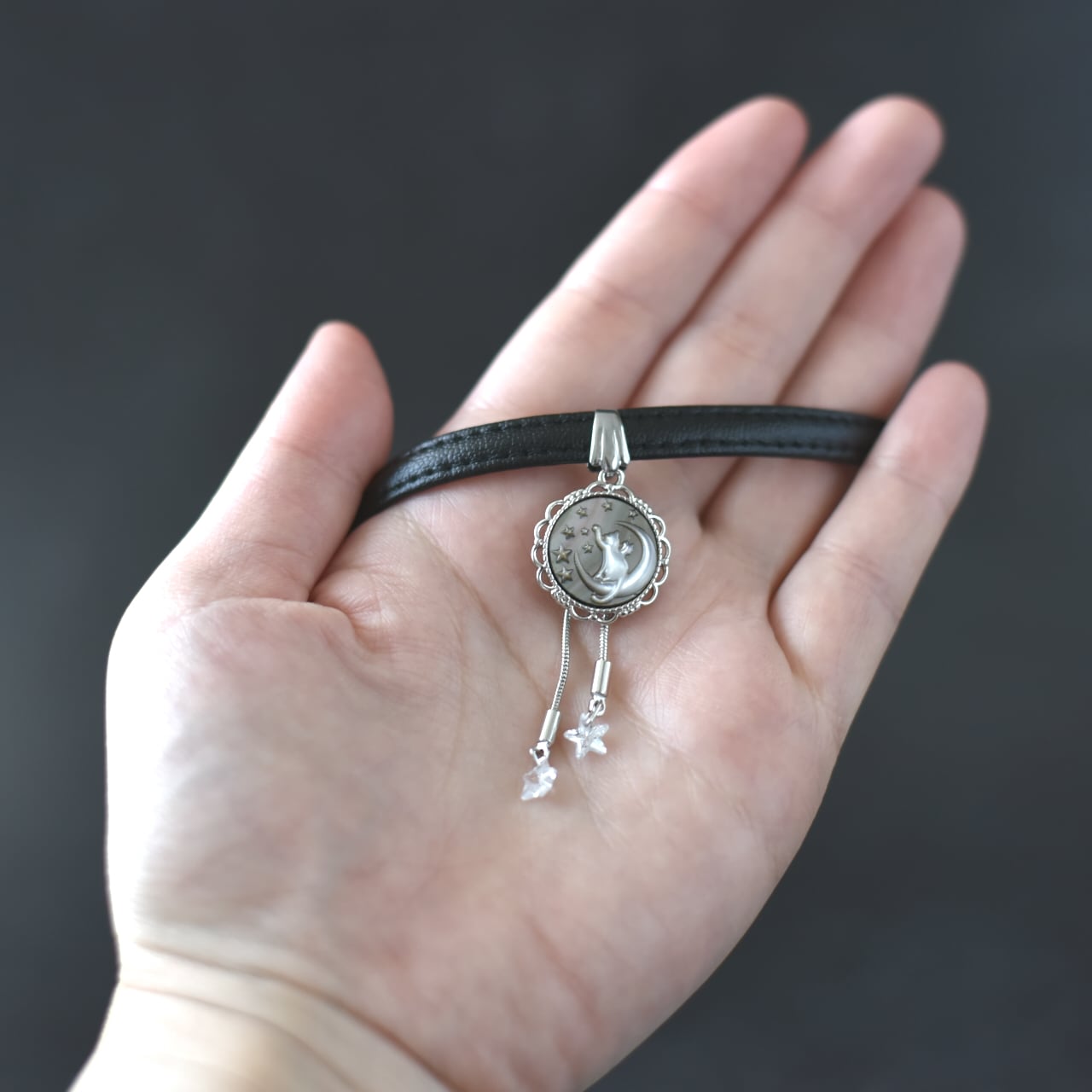 星拾いの天使猫|夜空の月に宿る天然貝のモチーフとキュービックジルコニアの星が揺れる黒合皮チョーカー/ゴシック 夜空 シェル