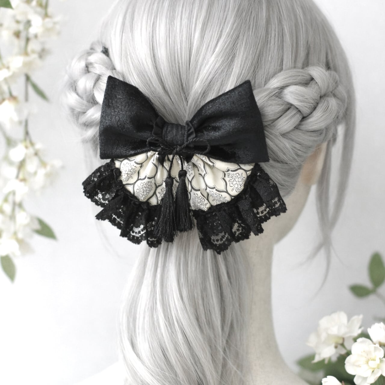 春灯の便り|モノクロとベロア調のダブルダマスク模様生地と黒レースに房飾りが重なるジャボタイ2wayリボン/ゴシック 華ロリ 中華風 タッセル モノトーン
