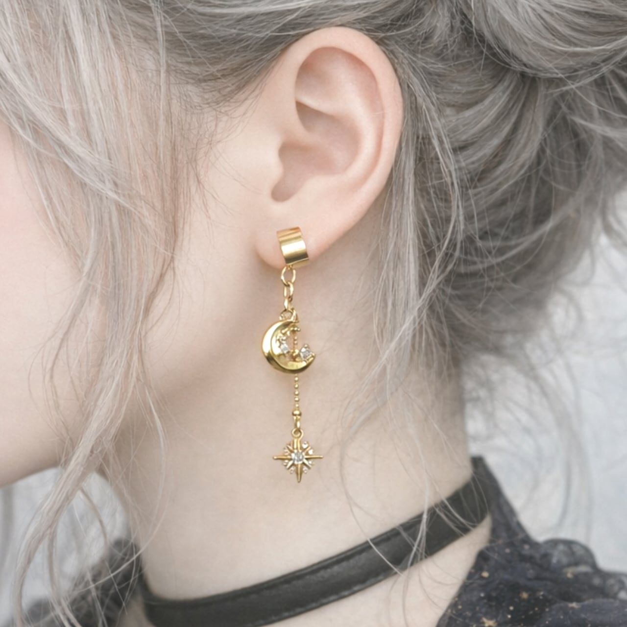 …Votum stellarum…|月と星の輝きが縦に連なる幻想的なイヤーカフ/スター ムーン ファンタジー イヤリング ノンホールピアス