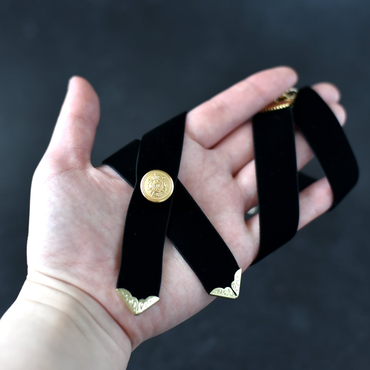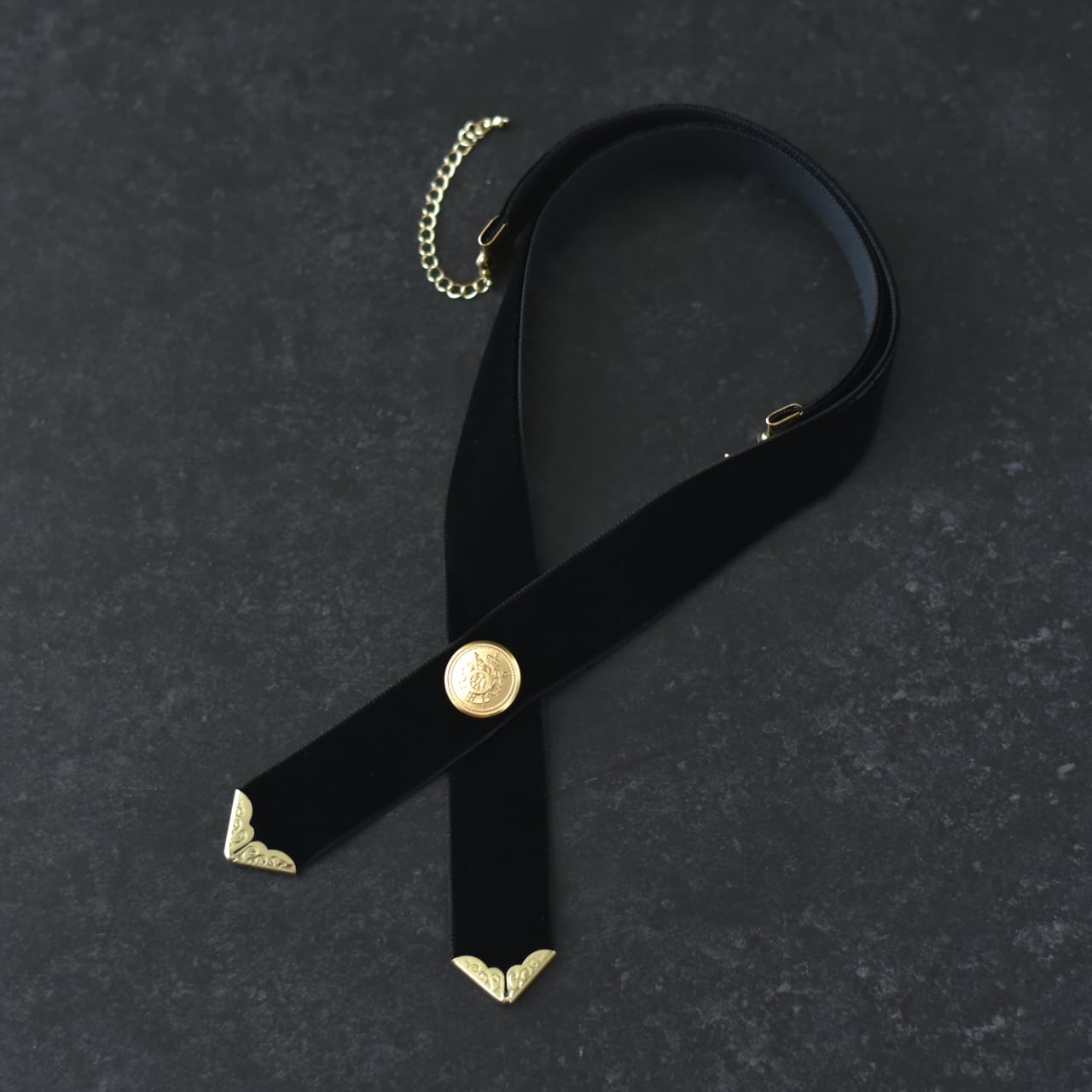 夜の帳|漆黒のベルベットと金色紋章が気高く映えるクロスタイチョーカー/ゴシック 王子風 舞踏会 黒 金 アンティーク メンズ